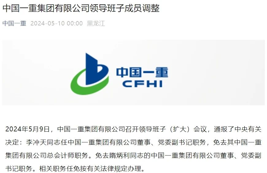 5月9日,中國(guó)一重集團(tuán)有限公司召開領(lǐng)導(dǎo)班子(擴(kuò)大)會(huì)議,通報(bào)了中央有關(guān)決定:李沖天同志任中國(guó)一重集團(tuán)有限公司董事、黨委副書記職務(wù),免去其中國(guó)一重集團(tuán)有限公司總會(huì)計(jì)師職務(wù)。免去隋炳利同志的中國(guó)一重集團(tuán)有限公司董事、黨委副書記職務(wù)。相關(guān)職務(wù)任免按有關(guān)法律規(guī)定辦理。