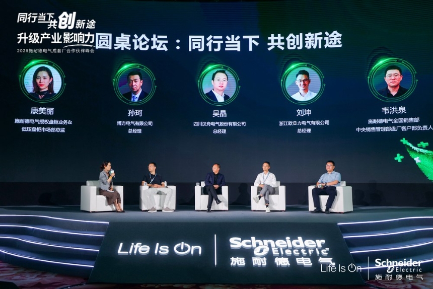 峰會現(xiàn)場,在以“同行當(dāng)下,共創(chuàng)新途”為主題的圓桌論壇中,博方電氣有限公司總經(jīng)理孫珂、四川漢舟電氣股份有限公司總經(jīng)理吳晶、浙江歐日力電氣有公司總經(jīng)理劉坤、施耐德電氣授權(quán)盤柜業(yè)務(wù)&低壓盤柜市場部總監(jiān)康美麗、施耐德電氣全國銷售部中央銷售管理部盤廠客戶部負(fù)責(zé)人韋洪泉齊聚一堂,共同探討行業(yè)發(fā)展新趨勢,詳細(xì)分享與施耐德電氣聯(lián)合創(chuàng)新合作經(jīng)驗,為行業(yè)轉(zhuǎn)型提供可復(fù)制、可落地的實踐案例,合力打造更具韌性與創(chuàng)新活力的協(xié)作生態(tài)。