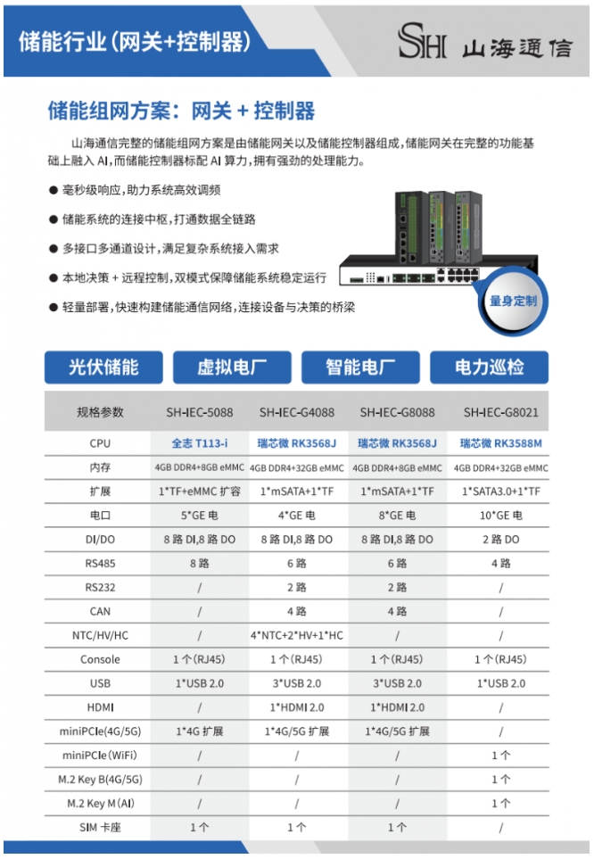 山海通信完整的儲(chǔ)能組網(wǎng)方案是由儲(chǔ)能網(wǎng)關(guān)以及儲(chǔ)能控制器組成,儲(chǔ)能網(wǎng)關(guān)在完整的功能基礎(chǔ)上融入 A,而儲(chǔ)能控制器標(biāo)配 AI算力,擁有強(qiáng)勁的處理能力。