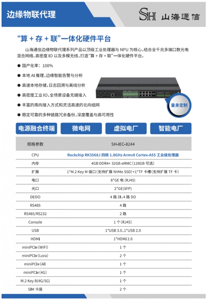 山海通信邊緣物聯(lián)代理系列產(chǎn)品以頂級(jí)工業(yè)處理器與 NPU為核心,結(jié)合全千兆多端口數(shù)光電混合網(wǎng)絡(luò)、高密度IO以及多模無(wú)線,打造“算+存+聯(lián)”一體化硬件平臺(tái)。