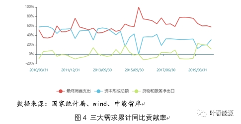 同時(shí),從消費(fèi)、投資和國(guó)外三大需求累計(jì)同比對(duì)GDP貢獻(xiàn)率看,消費(fèi)對(duì)經(jīng)濟(jì)增長(zhǎng)的貢獻(xiàn)率逐步成為中流砥柱,而投資形成貢獻(xiàn)率趨于穩(wěn)定。