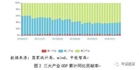分產(chǎn)業(yè)看,10余年來(lái),隨著我國(guó)經(jīng)濟(jì)結(jié)構(gòu)的轉(zhuǎn)型,三大產(chǎn)業(yè)對(duì)GDP的貢獻(xiàn)率發(fā)生明顯變化。2010至2019年,第三產(chǎn)業(yè)GDP貢獻(xiàn)率由39.7%上升至59.4%,增加接近20個(gè)百分點(diǎn);第二產(chǎn)業(yè)GDP貢獻(xiàn)率由58.6%降至36.8%,下降21.8個(gè)百分點(diǎn)。三大產(chǎn)業(yè)貢獻(xiàn)率格局基本穩(wěn)定,第三產(chǎn)業(yè)成為拉動(dòng)GDP的生力軍,其占比上升5.7個(gè)百分點(diǎn);二產(chǎn)占比下降6.6個(gè)百分點(diǎn)。2019年,第三產(chǎn)業(yè)和城鄉(xiāng)居民生活用電量對(duì)全社會(huì)用電量增長(zhǎng)的貢獻(xiàn)率達(dá)51.0%,比上年提高11.1個(gè)百分點(diǎn),其中第三產(chǎn)業(yè)貢獻(xiàn)率比上年提高10.1個(gè)百分點(diǎn),是支撐全社會(huì)用電量增長(zhǎng)的主要?jiǎng)恿Α?/p>