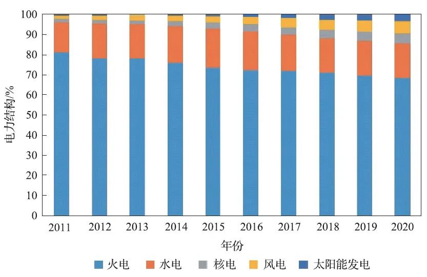 近年來,我國風、光等新能源發(fā)電技術快速發(fā)展,裝機容量快速提升,風、光發(fā)電量占比由2011 年的1.5%增加到2020 年的9.4%,推動非化石能源電力在我國電力結構中的占比顯著上升,由2011 年的18.3%增加到2020 年的31.5%,但依然沒有改變我國以火電(煤電)為主的電力結構。2020 年我國電力結構中火電發(fā)電量占比68.5%。
