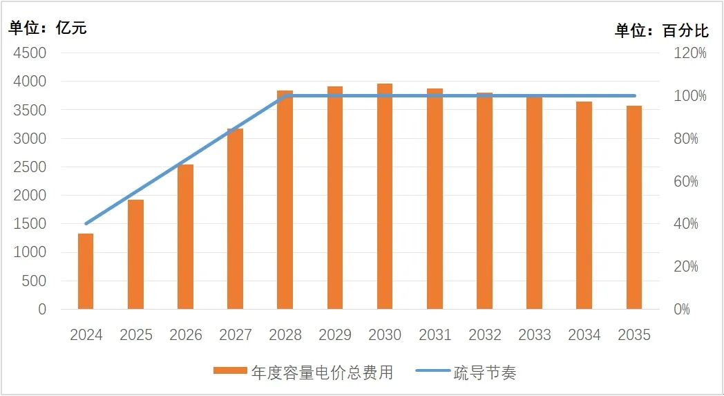 圖2 年度容量電價總費用及疏導(dǎo)節(jié)奏(按趨勢預(yù)估測算)