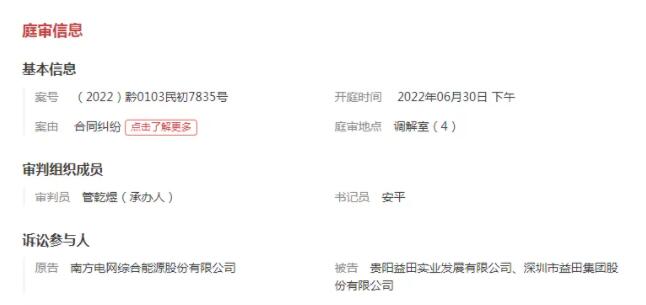 6月28日,深圳市益田集團(tuán)股份有限公司新增開庭公告,開庭時(shí)間為2022年06月30日 15:00,案號(hào)為(2022)黔0103民初7835號(hào),案由系合同糾紛,上訴人/原告為南方電網(wǎng)綜合能源股份有限公司,被上訴人/被告為貴陽益田實(shí)業(yè)發(fā)展有限公司,深圳市益田集團(tuán)股份有限公司,法院為貴州省貴陽市云巖區(qū)人民法院。