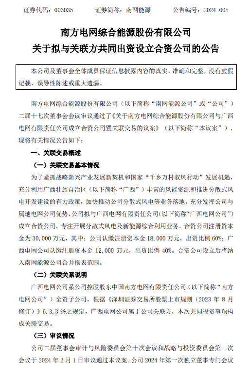 2月7日,南方電網(wǎng)綜合能源股份有限公司發(fā)布公告稱,擬與廣西電網(wǎng)有限責任公司(下稱“廣西電網(wǎng)”)成立合資公司廣西綜合能源有限公司,專注開展分散式風電及新能源綜合利用業(yè)務。