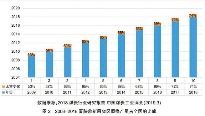 在供給側(cè)結(jié)構(gòu)性改革政策的推動(dòng)下,煤炭產(chǎn)能集中度進(jìn)一步提高。十八大以來,國務(wù)院相繼出臺(tái)了關(guān)于深化煤炭市場(chǎng)化改革的一系列文件,增大了煤炭去產(chǎn)能力度,截至到2018年底,基本上提前完成了“十三五”煤炭去產(chǎn)能8億噸的計(jì)劃,淘汰關(guān)閉了一大批不合標(biāo)準(zhǔn)的煤礦。同時(shí),為了滿足日益增長(zhǎng)的能源市場(chǎng)需要,新建、擴(kuò)建、技改一批現(xiàn)代化礦井,產(chǎn)能已達(dá)到14.96億噸。據(jù)中國煤炭工業(yè)協(xié)會(huì)統(tǒng)計(jì),全國煤礦數(shù)量從2015年的1.08萬處減少到目前的5800處,年產(chǎn)能120萬噸及以上的大型煤礦產(chǎn)量超過80%,年產(chǎn)能30萬噸及以下小型煤礦減少至10%以下。煤炭開采向大型煤炭基地集中,其產(chǎn)量占全國總產(chǎn)量的95%以上,5000萬噸級(jí)以上大型礦井產(chǎn)量占60%以上。煤炭生產(chǎn)布局進(jìn)一步向晉、陜、蒙、新地區(qū)等地區(qū)集中。2018年,內(nèi)蒙古、山西、陜西、新疆、貴州、山東、河南、安徽等8個(gè)億噸級(jí)規(guī)模以上企業(yè)原煤產(chǎn)量達(dá)31.2億噸,占全國的88.1%,其中,晉、陜、蒙、新四省(區(qū))原煤產(chǎn)量占全國的74.3%。見圖1、圖2。