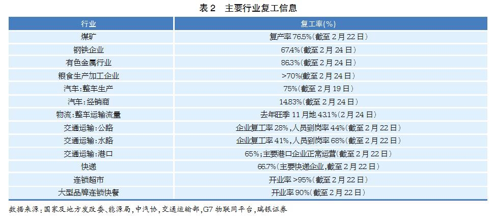 新冠疫情暴發(fā)以來(lái),為防止疫情擴(kuò)散,除去武漢等13個(gè)城市封城以外,大多數(shù)省份選擇延遲復(fù)工復(fù)產(chǎn)、嚴(yán)格實(shí)施出行管控。雖然自2月以來(lái),國(guó)內(nèi)政策重心已由防控疫情逐漸向企業(yè)復(fù)工傾斜,各地區(qū)開(kāi)始分層分級(jí)推動(dòng)有序復(fù)工,但復(fù)工效率不及預(yù)期。由于地方隔離措施無(wú)法統(tǒng)一,返工人員明顯不足、交通物流依然不暢、產(chǎn)業(yè)鏈上下游尚未匹配、口罩等防疫物資持續(xù)不足,因此地區(qū)公布的企業(yè)復(fù)工數(shù)據(jù)僅代表企業(yè)獲得復(fù)工許可,產(chǎn)能實(shí)質(zhì)上未得到充分利用,“復(fù)工難復(fù)產(chǎn)”問(wèn)題依然嚴(yán)峻。真正的全面復(fù)工可能需要到3月中下旬甚至更晚,而服務(wù)業(yè)的復(fù)工進(jìn)度更慢(注1)(見(jiàn)表1)。