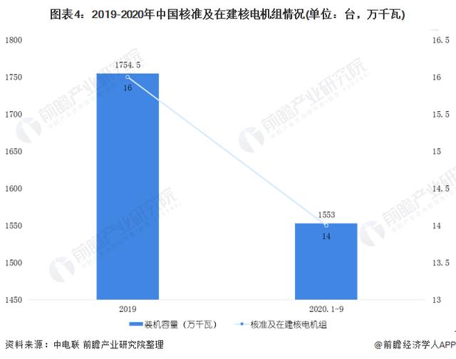 根據中電聯(lián)的數據顯示,截至2019年底,我國核準及在建核電機組16臺,裝機容量1754.5萬千瓦,位居世界第一。而截止到2020年9月底,在建核電機組14臺,總裝機容量1553萬千瓦。