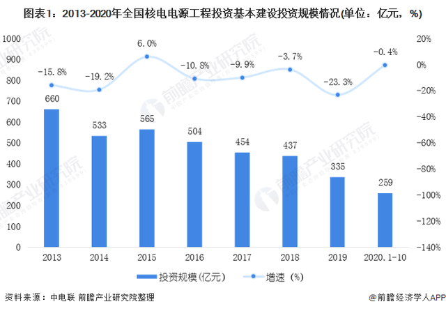 受到福島核電站等事故的影響,我國核電建設雖然處在高速發(fā)展期,但是保持著以“穩(wěn)”為主的基調,新開工機組數量較少,核電工程投資額有所下滑。根據中國電力企業(yè)聯(lián)合會的統(tǒng)計數據顯示,2020年1-10月,全國主要核電企業(yè)電源工程完成投資259億元,同比下降0.4%。