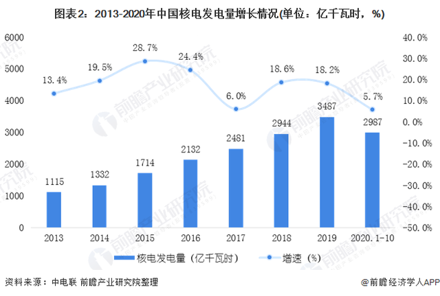 雖然近年來受國家核電批復減少以及新建投資額的降低的影響,我國核電主要企業(yè)電源項目在建規(guī)模有所縮小,但是隨著項目的完工,我國核電裝機規(guī)模不斷擴大,發(fā)電量同步提高。根據中國電力企業(yè)聯(lián)合會的數據顯示,2020年1-10月,全國核電發(fā)電量2987億千瓦時,同比增長5.7%,增速比上年同期回落13.6個百分點。