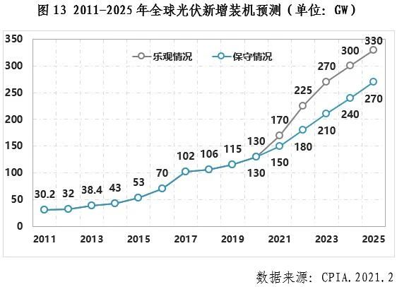 (二)我國光伏市場(chǎng)將進(jìn)入快速發(fā)展新階段2021年是“十四五”規(guī)劃的開局之年,也是我國光伏發(fā)電進(jìn)入平價(jià)上網(wǎng)的關(guān)鍵之年。2021年我國光伏應(yīng)用市場(chǎng)將繼續(xù)保持快速增長勢(shì)頭,預(yù)計(jì)新增裝機(jī)規(guī)??蛇_(dá)55-65GW,其中競(jìng)價(jià)結(jié)轉(zhuǎn)項(xiàng)目10GW左右,戶用市場(chǎng)有望達(dá)到15GW,工商業(yè)分布式預(yù)計(jì)在10GW左右,外送及平價(jià)地面電站在20-30GW左右。在“碳達(dá)峰、碳中和”目標(biāo)下, “十四五”期間我國光伏市場(chǎng)將迎來市場(chǎng)化建設(shè)高峰,預(yù)計(jì)國內(nèi)年均光伏裝機(jī)新增規(guī)模在70-90GW,有望進(jìn)一步加速我國能源轉(zhuǎn)型。