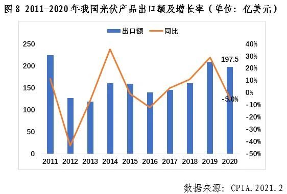 摘要:2020年,受新冠肺炎疫情的影響,全球經(jīng)濟(jì)倒退,然而我國光伏行業(yè)逆流而上,取得了令人矚目的成就,保持并延續(xù)了多項(xiàng)世界第一。應(yīng)用市場(chǎng)實(shí)現(xiàn)恢復(fù)性增長,2020年我國光伏新增裝機(jī)48.2GW,連續(xù)8年位居全球首位;累計(jì)裝機(jī)量達(dá)到253GW,連續(xù)6年位居全球首位;產(chǎn)業(yè)規(guī)模持續(xù)擴(kuò)大,制造端四個(gè)主要環(huán)節(jié)實(shí)現(xiàn)兩位數(shù)增長,多晶硅產(chǎn)量39.2萬噸,連續(xù)10年位居全球首位;光伏組件產(chǎn)量124.6GW,連續(xù)14年位居全球首位;出口市場(chǎng)穩(wěn)中有升,光伏產(chǎn)品出口額197.5億美元,同比下降5%,但組件出口量則達(dá)到78.8GW,創(chuàng)歷史新高,同比增長18.3%。