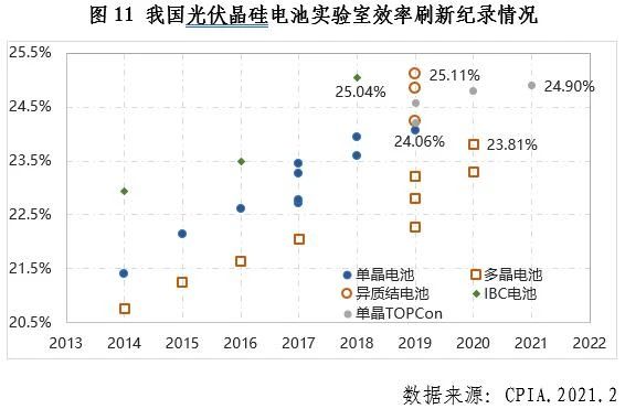 實(shí)驗(yàn)室方面,2020年4月,晶科研發(fā)的多晶硅(Multicrystalline)電池片實(shí)驗(yàn)室效率達(dá)到23.3%,并被收錄于NREL電池片轉(zhuǎn)換效率紀(jì)錄表中,隨后阿特斯宣布將該效率提高至23.81%。7月,晶科宣布其研發(fā)的N型單晶硅單結(jié)電池片效率達(dá)到24.79%,2021年1月,將該紀(jì)錄再次刷新到24.90%,創(chuàng)造了新的大面積N型單晶鈍化接觸電池片效率世界紀(jì)錄。我國除了在晶硅電池技術(shù)方面領(lǐng)先全球外,鈣鈦礦、有機(jī)電池等電池片實(shí)驗(yàn)室效率也走在世界前列,2020年7月,杭州纖納光電以18.04%的鈣鈦礦小組件光電轉(zhuǎn)換效率的成績(jī),第七次蟬聯(lián)了鈣鈦礦小組件世界紀(jì)錄榜首。目前NREL電池片轉(zhuǎn)換效率紀(jì)錄表中,除晶科的多晶硅電池片外,上海交大/北航、中科院化學(xué)所和漢能分別研發(fā)的有機(jī)電池、有機(jī)疊層電池和薄膜電池仍保持著世界紀(jì)錄。