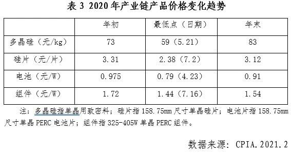 (四)產(chǎn)業(yè)鏈供給矛盾突出2020年,光伏產(chǎn)品價(jià)格經(jīng)歷了V字型起伏的過程,光伏產(chǎn)業(yè)硅料、玻璃和EVA膠膜等部分原輔材料環(huán)節(jié)出現(xiàn)的供需緊張也前所未有。上半年,受全球疫情蔓延影響,對(duì)下游應(yīng)用市場(chǎng)未來需求的不確定性導(dǎo)致產(chǎn)業(yè)鏈大幅降價(jià),各環(huán)節(jié)價(jià)格降幅均在20%左右。硅料環(huán)節(jié),三季度受到事故及自然災(zāi)害等因素影響供應(yīng)緊張,8月多晶硅致密料價(jià)格由6月的59元/公斤增加至約95元/公斤,漲幅約為60%;四季度隨著新疆地區(qū)硅料企業(yè)復(fù)工,多晶硅價(jià)格回落,但仍高于二季度價(jià)格低點(diǎn)38%。EVA膠膜的生產(chǎn)設(shè)備及原材料EVA粒子可用于防疫物資生產(chǎn),2020年防疫物資需求暴漲,使得生產(chǎn)設(shè)備及EVA粒子供應(yīng)緊張,膠膜企業(yè)擴(kuò)產(chǎn)受阻延遲,在下半年需求暴漲的情況下,EVA膠膜企業(yè)只能通過大幅漲價(jià)的方式來獲取EVA粒子資源。下半年EVA膠膜價(jià)格上漲了50%,一度達(dá)到14元/平方米的高價(jià),和POE膠膜的價(jià)格形成了倒掛。下半年需求的集中爆發(fā)導(dǎo)致光伏玻璃供給出現(xiàn)巨大缺口,價(jià)格快速上漲,年底3.2mm光伏玻璃價(jià)格達(dá)到了43元/平方米,較5-6月最低時(shí)上漲80%,部分企業(yè)采用浮法玻璃作為雙面組件的背板玻璃。進(jìn)入12月,產(chǎn)品價(jià)格趨于平緩。但全年來看,除多晶硅價(jià)格上漲13.7%以外,硅片、電池、組件產(chǎn)品價(jià)格仍分別下降了5.7%、6.7%與10.5%,降本增效發(fā)展方向沒有變,長期來看價(jià)格依然是下降趨勢(shì)。