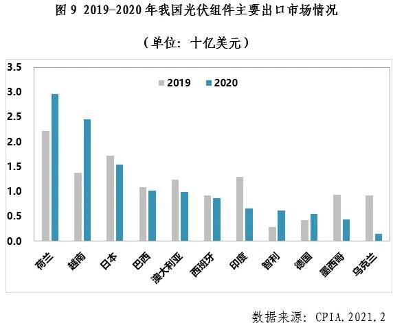 從光伏組件出口市場(chǎng)來看,2020年光伏組件主要出口市場(chǎng)中傳統(tǒng)市場(chǎng)活力不減,其中荷蘭和越南市場(chǎng)份額增長明顯。在光伏發(fā)電成本持續(xù)降低以及歐盟綠色協(xié)議的背景下,歐洲市場(chǎng)保持增長勢(shì)頭,荷蘭作為歐洲市場(chǎng)的集散中心出口量持續(xù)增長。越南新一輪FIT政策引發(fā)了越南屋頂光伏的搶裝熱潮,根據(jù)越南工貿(mào)部的公告顯示,2020年越南光伏新增裝機(jī)為10.75GW,成為全球前3大光伏市場(chǎng),其中屋頂光伏裝機(jī)超過9GW。越南市場(chǎng)新增裝機(jī)猛增,對(duì)我國組件需求明顯增長,成為第二大光伏組件出口市場(chǎng)。印度市場(chǎng)受疫情影響,市場(chǎng)需求下降較為明顯。曾經(jīng)的新興市場(chǎng)烏克蘭因其國內(nèi)電價(jià)的下降致使光伏項(xiàng)目的收益有所降低,投資熱情減退,市場(chǎng)需求下降。墨西哥市場(chǎng)受到清潔能源拍賣的取消以及后續(xù)政策不確定性的影響未能延續(xù)之前的增長勢(shì)頭,市場(chǎng)需求有所下降。