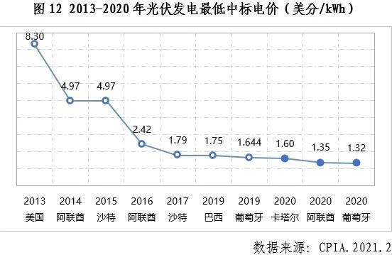(五)光伏發(fā)電電價(jià)與成本持續(xù)下降2020年,全球光伏發(fā)電中標(biāo)電價(jià)繼續(xù)下降,僅一年中全球就有三個(gè)項(xiàng)目接連創(chuàng)造了最低中標(biāo)電價(jià)。8月,位于葡萄牙一光伏項(xiàng)目中標(biāo)電價(jià)達(dá)到了0.0112歐元/kWh(約1.32美分/kWh),折合當(dāng)時(shí)人民幣價(jià)格約0.091元/kWh。這一電價(jià)比2019年最低中標(biāo)電價(jià)降低了0.324美分/kWh,降幅達(dá)到19.7%。2020年,我國光伏發(fā)電項(xiàng)目中標(biāo)電價(jià)也刷新最低紀(jì)錄,青海海南州一光伏發(fā)電競(jìng)價(jià)項(xiàng)目中標(biāo)電價(jià)為0.2427元/kWh(約3.46美分/kWh),低于2019年達(dá)拉特旗光伏項(xiàng)目0.26元/kWh的電價(jià)。除此之外,卡塔爾、阿聯(lián)酋、印度等國光伏中標(biāo)電價(jià)也打破了原來的最低紀(jì)錄。光伏發(fā)電價(jià)格已經(jīng)在全球越來越多的國家及地區(qū)低于火電,成為了最具競(jìng)爭(zhēng)力的電力產(chǎn)品。
