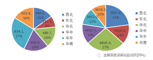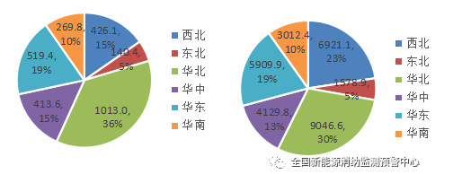 四季度各區(qū)域新增(左)、累計(jì)(右)并網(wǎng)光伏發(fā)電裝機(jī)(萬(wàn)千瓦)