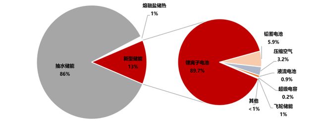 目前蓄水儲(chǔ)能在我國(guó)仍舊占據(jù)主要地位,是國(guó)內(nèi)主要的儲(chǔ)能模式,但是以電化學(xué)儲(chǔ)能的發(fā)展規(guī)模正在快速追趕。截至2021年底,國(guó)內(nèi)86%的儲(chǔ)能市場(chǎng)由抽水儲(chǔ)能構(gòu)成,而新型儲(chǔ)能的占比達(dá)到13%。在國(guó)內(nèi)電化學(xué)儲(chǔ)能市場(chǎng)中,鋰離子電池占據(jù)絕對(duì)主導(dǎo)地位,市場(chǎng)份額達(dá)到 89.7%。