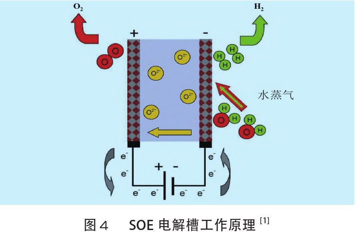 固體氧化物電解槽(SOE)利用高溫水蒸氣(600~900℃)電解,效率高于堿性電解槽和PEM電解槽。20世紀(jì)60年代,美國和德國就開始進行SOE高溫水蒸氣的相關(guān)研究。SOE電解槽的工作原理如圖4所示。循環(huán)氫氣和水蒸氣從陽極進入反應(yīng)系統(tǒng),水蒸氣在陰極電解成氫氣,陰極產(chǎn)生的O2–通過固體電解質(zhì)移動到陽極,重新結(jié)合形成氧氣并釋放電子。