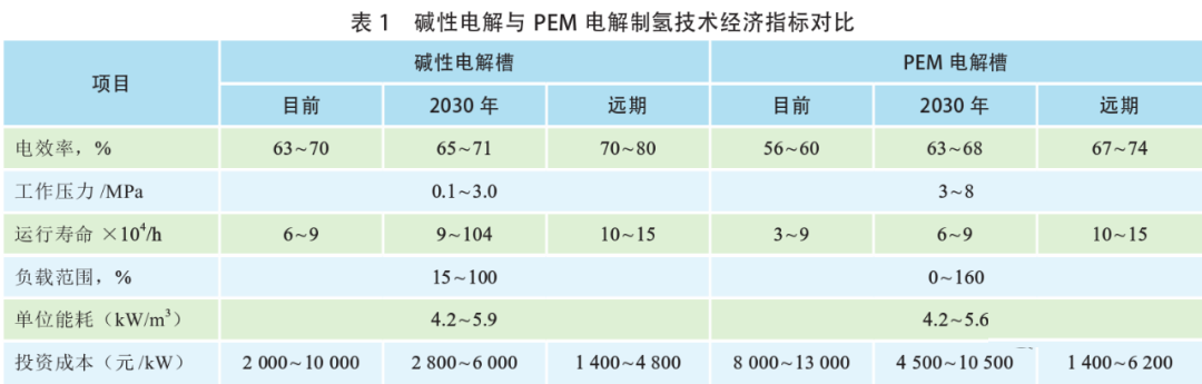 我國以可再生能源(如風(fēng)電、光伏、水電)進行電解水制氫,電價控制在0.25元/kWh以下時,制氫成本具有相對經(jīng)濟性(15.3~20.9元/kg)。堿性電解與PEM電解制氫技術(shù)經(jīng)濟指標(biāo)見表1。