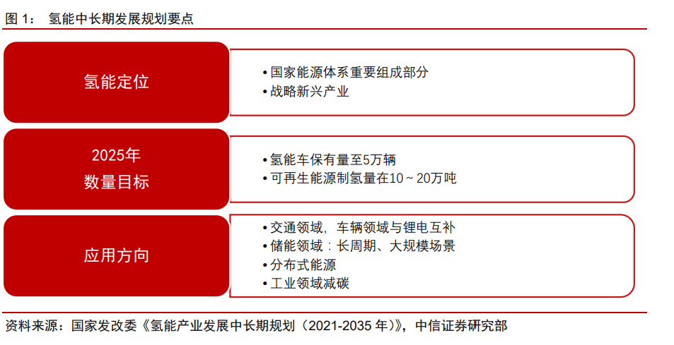 行業(yè)中長期規(guī)劃對投資而言主要有三大核心要點(diǎn),包括氫能定位、未來發(fā)展目標(biāo)以及應(yīng)用方向。