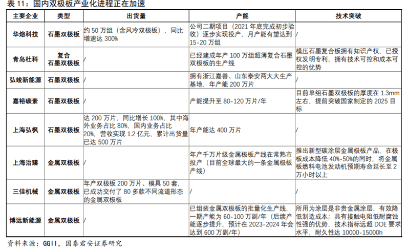 國(guó)內(nèi)產(chǎn)業(yè)化進(jìn)程正在加速:據(jù)GGII統(tǒng)計(jì),2021年期間,國(guó)內(nèi)主流雙極板企業(yè)出貨量增長(zhǎng)顯著,金屬雙極板領(lǐng)域已出現(xiàn)單個(gè)企業(yè)單個(gè)客戶(hù)出貨達(dá)百萬(wàn)片級(jí)別的現(xiàn)象;石墨板市場(chǎng)各家出貨也均有較大增長(zhǎng),表現(xiàn)明顯的是原萬(wàn)片級(jí)出貨企業(yè)的出貨量級(jí)達(dá)到10萬(wàn)片以上,頭部企業(yè)的出貨更是達(dá)到了50萬(wàn)片/年以上。