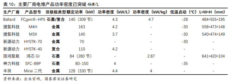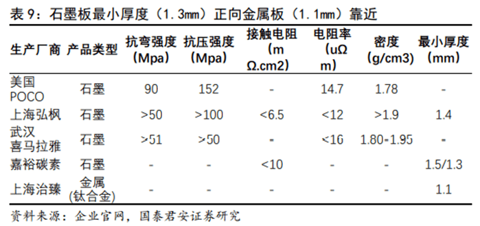 石墨板適應(yīng)需求趨于薄型化,乘用車(chē)為金屬板帶來(lái)機(jī)遇。石墨板:由于其高耐腐蝕性、高耐久性,以及相對(duì)較低的技術(shù)壁壘,率先實(shí)現(xiàn)國(guó)產(chǎn)化,在對(duì)體積較不敏感而對(duì)耐久性敏感的特種車(chē)、商用車(chē)領(lǐng)域示范應(yīng)用。然而,石墨雙極板的制作周期長(zhǎng)、機(jī)械性能差、加工難度大、制作成本高等劣勢(shì)也不可忽視。市場(chǎng)已有越來(lái)越多的企業(yè)成功開(kāi)發(fā)出超薄超精細(xì)石墨雙極板,提前突破了國(guó)家制定2025年前單組石墨雙極板厚度1.5mm的要求,功率密度開(kāi)始接近豐田第一代金屬雙極板的水平。金屬板:抗腐蝕性差,壽命過(guò)短是其應(yīng)用的阻礙,然而隨著涂層工藝的持續(xù)進(jìn)步與突破,其有望實(shí)現(xiàn)和石墨板相同的使用壽命。豐田汽車(chē)公司率先在旗下Mirai燃料電池汽車(chē)上使用金屬雙極板和涂層,解決了腐蝕、成本和導(dǎo)電等一系列問(wèn)題。憑借其機(jī)械性能優(yōu)異、高體積功率密度、成本低廉且易批量生產(chǎn)等優(yōu)勢(shì),金屬雙極板將在乘用車(chē)規(guī)?;瘧?yīng)用的進(jìn)程中實(shí)現(xiàn)突破。