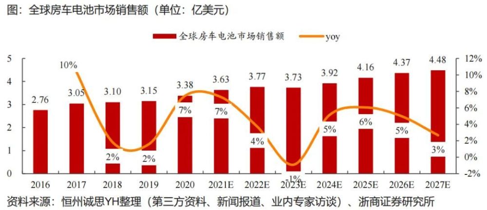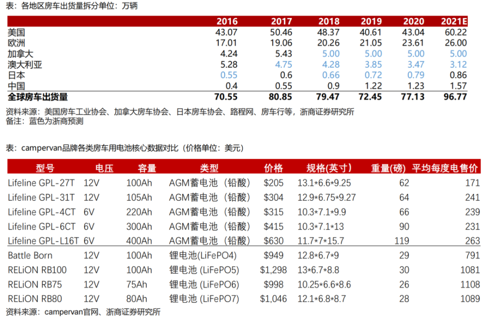 房車儲(chǔ)能:鉛酸電池儲(chǔ)能系統(tǒng)相對(duì)成熟,已被成品房車大量使用;近幾年趨勢(shì)會(huì)加配折疊太陽(yáng)能電池板,備用發(fā)電。根據(jù)恒州誠(chéng)思數(shù)據(jù),預(yù)計(jì)2026年房車用電池市場(chǎng)銷售額4.37億美元;伴隨儲(chǔ)能系統(tǒng)迭代升級(jí),房車儲(chǔ)能有較大機(jī)會(huì)。具體如下圖所示: