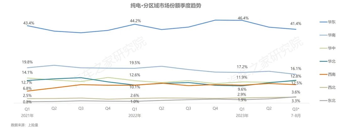 從區(qū)域角度上看,以長三角為代表的華東地區(qū)是中國發(fā)展的重要引擎,匯聚多個(gè)經(jīng)濟(jì)發(fā)達(dá)的省、市,更高的本地居民收入與完善的充電基礎(chǔ)設(shè)施配套,促使當(dāng)?shù)叵M(fèi)者對(duì)新能源純電汽車更加旺盛的購車需求,其市場份額長期保持在40%以上,成為新能源純電車型最為重要的區(qū)域市場;華南地區(qū)以16%左右的份額位居第二;華中、華北、西南市場占比均在12%左右,份額十分相近;西北、東北市場占比尚不足5%。