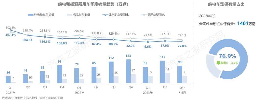 從新能源市場發(fā)展的趨勢上看,隨著技術(shù)的日漸成熟與明星車型的不斷涌現(xiàn),插混及增程車型的市場銷量增速長期處于領(lǐng)跑位置,純電車型市場增速相對(duì)較弱。而從絕對(duì)增量與存量兩個(gè)角度上看,新能源市場的大部分份額仍由純電車型所占據(jù),但市場正處于被緩慢的蠶食之中,目前全國純電動(dòng)汽車保有量為1400萬輛,占全部新能源車保有量的近77%。