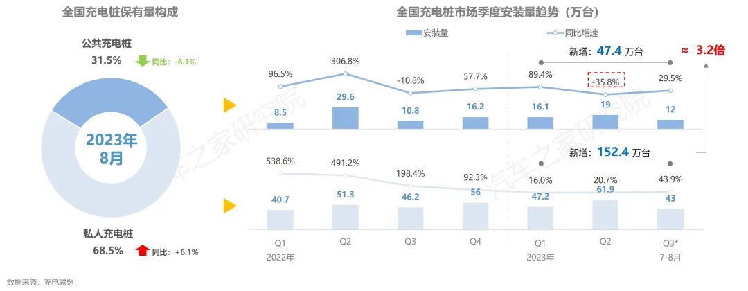 從結(jié)構(gòu)上看,私樁是目前新能源汽車補(bǔ)能的主要方式,占據(jù)充電樁近7成的保有量,而且發(fā)展增速更快。2023年1-8月,公共充電樁新增安裝47.4萬臺(tái),7-8月安裝12萬臺(tái),新增安裝量已超過去年整體Q3增量規(guī)模,恢復(fù)上行態(tài)勢,但其增量水平與整體規(guī)模,同私人充電樁規(guī)模相比差距增大。