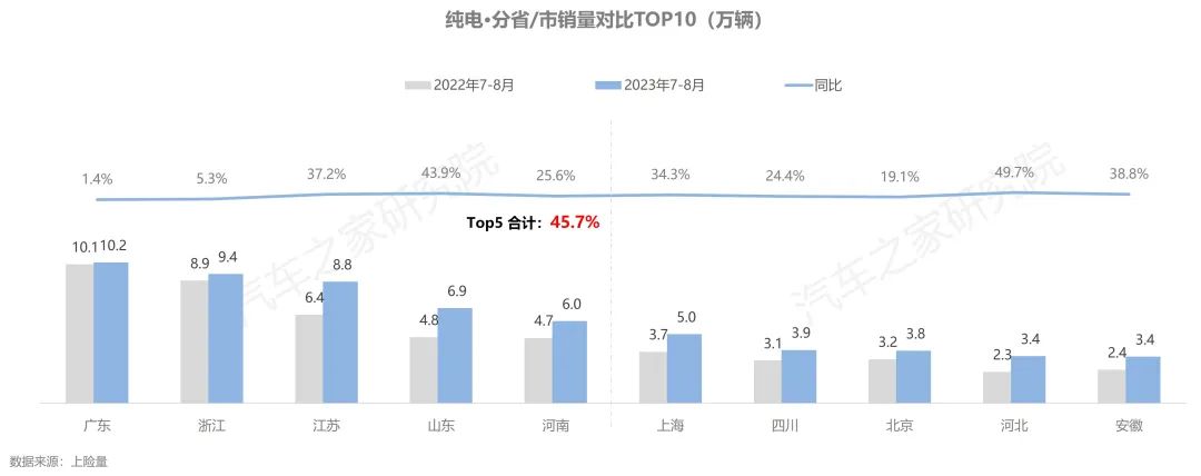 從省份角度看,在排名前五的省份中,廣東省是唯一銷量超過10萬輛的省份,繼續(xù)占據(jù)首位,排名第二至第五名的浙江、江蘇、山東、河南,五省合計(jì)占近50%的全國市場份額。排名前10的省份中,山東、河北省的市場成長性最為優(yōu)異,今年7-8月銷量同比增速近50%。