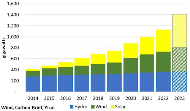 圖2:中國水電、風電和太陽能發(fā)電量(單位:千兆瓦)