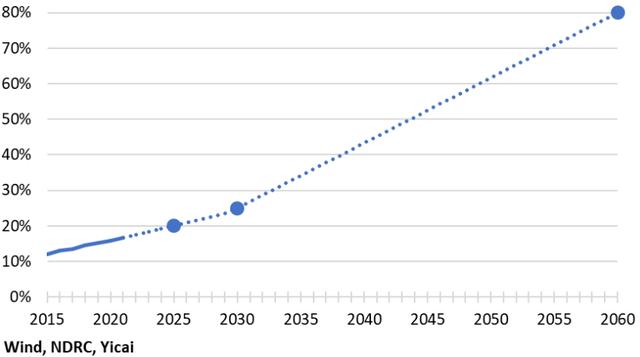 未來幾年可能會增加更多的非化石燃料產(chǎn)能。《“十四五”可再生能源發(fā)展規(guī)劃》預計,到2025年,非化石能源占中國能源消費的比重將從2021年的17%上升到25%。但這僅僅是個開始,根據(jù)中國的長期排放戰(zhàn)略,到2060年,非化石能源在能源消費中的比重將上升到80%。這表明,對低碳發(fā)電的大規(guī)模投資將持續(xù)三十多年(圖6)。