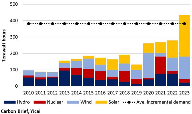 為了預測中國二氧化碳排放的路徑,碳簡報計算了電力需求的年均增幅(382太瓦時),并將其與經(jīng)由綠色能源產(chǎn)生電量的增幅進行比較(圖5)。如果前者小于后者,那么由化石燃料產(chǎn)生的電量將下降,與之相關(guān)的二氧化碳排放量也會下降。碳簡報表示,如果中國保持今年的綠色能源產(chǎn)能增長速度,那么對化石燃料的需求將繼續(xù)下降。