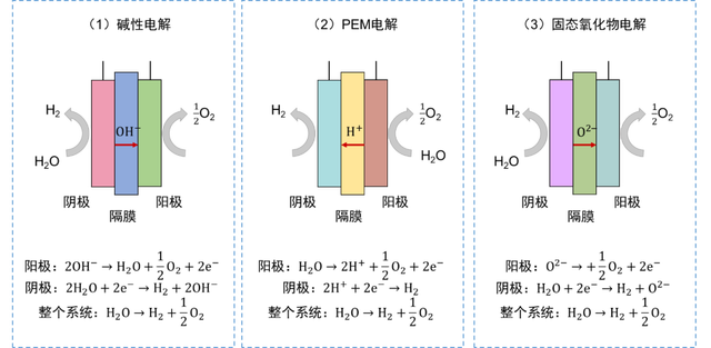 電解水制氫技術(shù)主要包括堿性電解水(ALK),質(zhì)子交換膜電解水(PEM)和固體氧化物電解水(SOE)以及其他電解水技術(shù)。前三者的基本原理如下圖所示。