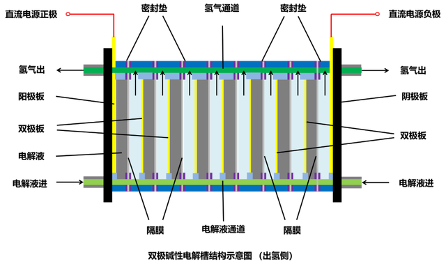 堿性電解水制氫系統(tǒng)主要包括堿性電解槽主體和輔助系統(tǒng)(BOP)。堿性電解槽主體由端壓板、密封墊、極板、電板、隔膜等零部件組裝而成,電解槽包括數(shù)十甚至上百個電解小室,由螺桿和端板把這些電解小室壓在一起形成圓柱狀或正方形,每個電解小室以相鄰的2個極板為分界,包括正負(fù)雙極板、陽極電極、隔膜、密封墊圈、陰極電極6個部分。