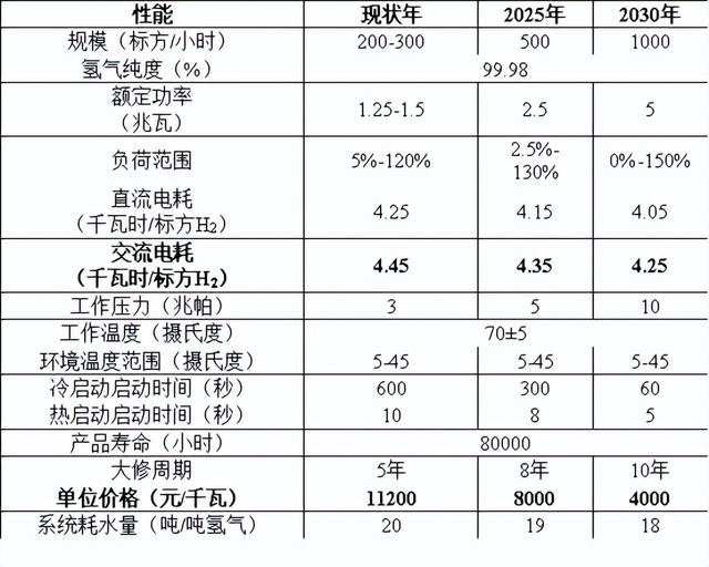 堿性電解槽主要成本構(gòu)成為電解電堆組件(45%)和系統(tǒng)輔機(55%);電解槽成本中55%是膜片及膜組件。依據(jù)行業(yè)內(nèi)多家主流廠商的數(shù)據(jù)分析,堿性電解槽的2025年及2030年的主要技術(shù)參數(shù)和投資水平如下: