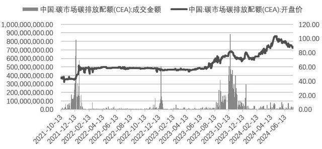 從碳排放權(quán)交易價(jià)格走勢(shì)看,2021年7月16日至2023年7月16日的兩年時(shí)間,基本穩(wěn)定在60元/噸。上市首日,開(kāi)盤(pán)價(jià)為48元/噸,9點(diǎn)30分首筆全國(guó)碳排放配額交易撮合成功,價(jià)格為52.78元/噸,總共成交16萬(wàn)噸,交易額為790萬(wàn)元。當(dāng)日收盤(pán),累計(jì)成交410萬(wàn)噸碳排放配額,成交額超過(guò)2.1億元,收盤(pán)價(jià)為51.23元/噸,較48元/噸上漲6.73%。