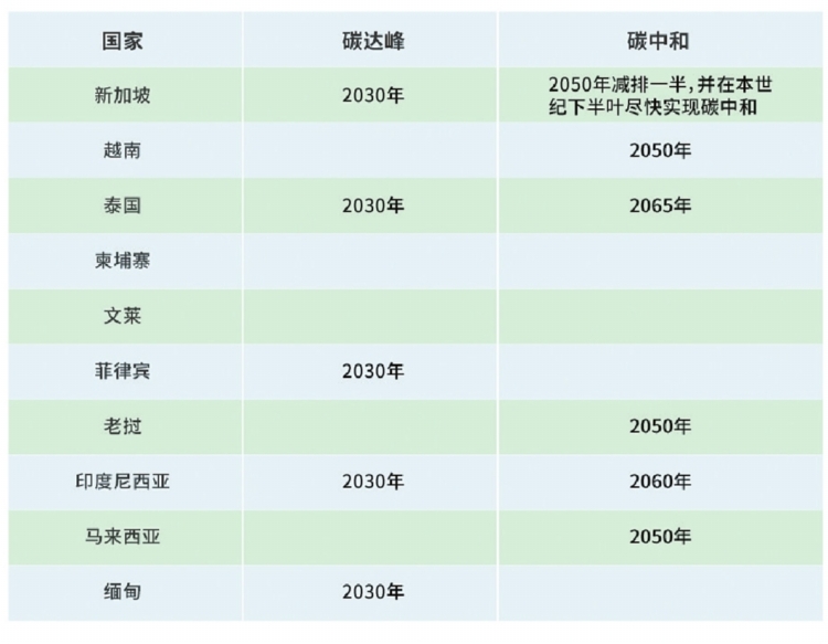 東盟各國(guó)碳達(dá)峰碳中和承諾時(shí)間表 (數(shù)據(jù)來(lái)源:各國(guó)自主貢獻(xiàn)目標(biāo)、中長(zhǎng)期減排發(fā)展戰(zhàn)略)