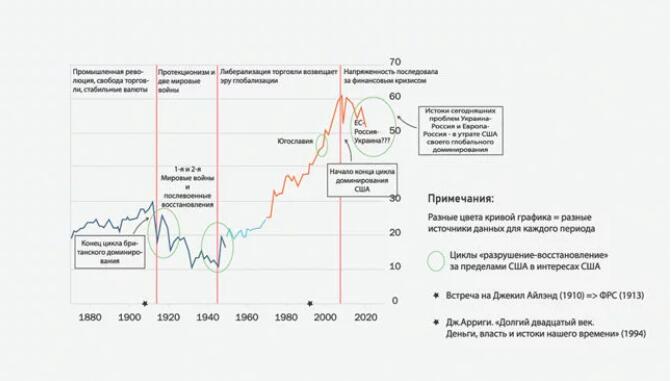 20世紀美國的兩次崛起可視為其積累周期、“漫長世紀”的基礎(chǔ)。這兩次崛起基于兩次世界大戰(zhàn)及其戰(zhàn)后恢復(fù)期,這里值得注意的是,兩次大戰(zhàn)均發(fā)生于歐洲和亞洲,不在美國的領(lǐng)土之上。很大程度上,美國為這兩次在其領(lǐng)土之外進行的戰(zhàn)爭和戰(zhàn)后重建提供了物資和技術(shù)(在擴展自己產(chǎn)量的基礎(chǔ)上)。另一方面,在美聯(lián)儲的運作下世界經(jīng)濟美元化的程度不斷加深??梢哉f,美國“漫長世紀”基于其疆域以外的世界經(jīng)歷“破壞—重建”,循環(huán)往復(fù)。