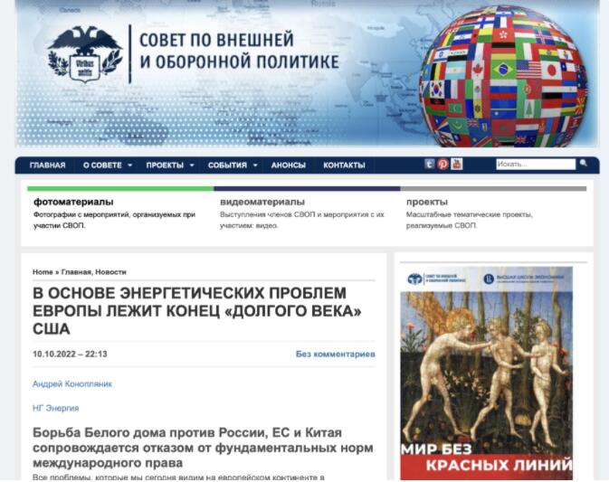 “歐洲的能源問題基于美國‘漫長世紀’終結(jié)”,截圖來自“俄羅斯外交與國防政策委員會”網(wǎng)站