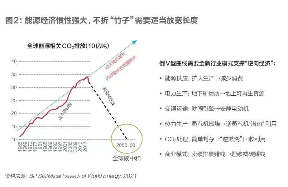 這個倒V型曲線需要全新的商業(yè)模式來支持逆向經(jīng)濟,即所有的能源供應(yīng)、電力生產(chǎn)等都要反過來,要從賣碳排碳賺錢的商業(yè)模式變成埋碳減碳賺錢的商業(yè)模式。