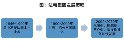 受到二戰(zhàn)后重建、石油危機的影響,法國政府希望在短時間內(nèi)快速建設法國電力工業(yè)。政府要求法電集團作為擔當此重任的主體。于是此階段法電重點發(fā)展本土的發(fā)電、輸電、配電業(yè)務,尤其是大量建設核電站。