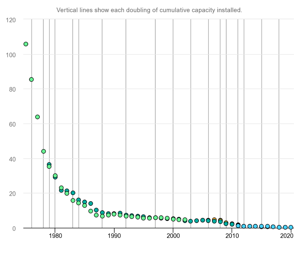 1970-2020 年太陽能光伏組件成本的演變