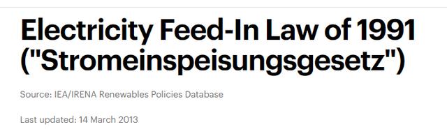 在此之前的1991年,德國已經(jīng)通過了《上網(wǎng)電價法(Stromeinspeisungsgesetz)》,推行可再生能源的補(bǔ)貼計劃。