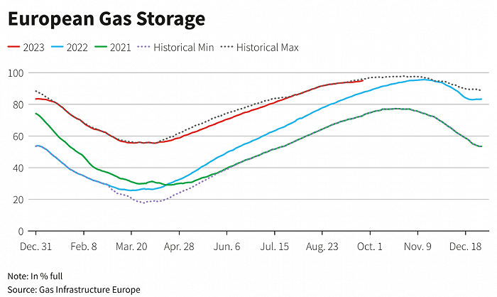 如前所述,歐洲天然氣基礎設施數(shù)據(jù)顯示,整個歐盟的天然氣儲存目前已高達96%,完全充滿后將可以滿足歐盟冬季天然氣需求的三分之一。