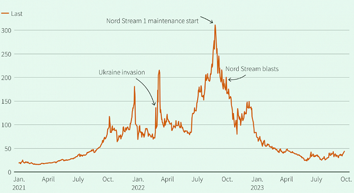 圖1;歐洲天然氣價格;歐元/兆瓦時;資料來源:LSEG