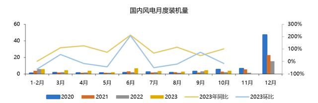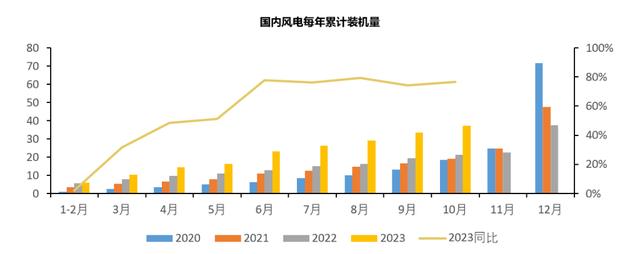 根據(jù)最新10月風(fēng)電裝機數(shù)據(jù),2023年1-10月,國內(nèi)新增風(fēng)電裝機37.31GW,同比增長76%,單10月新增裝機達到3.83GW,同比增長102%,環(huán)比下降16%??梢钥闯鰺o論單月裝機量還是累計規(guī)模都要遠優(yōu)于去年,側(cè)面印證國內(nèi)風(fēng)電可能迎來了拐點。